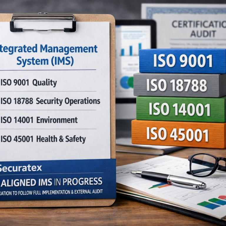 Securatex is implementing an Integrated Management System (IMS) aligned to ISO 9001 (Quality), ISO 18788 (Security Operations), ISO 14001 (Environment) and ISO 45001 (Occupational Health & Safety). Certification will be pursued following full system implementation and independent external audit.